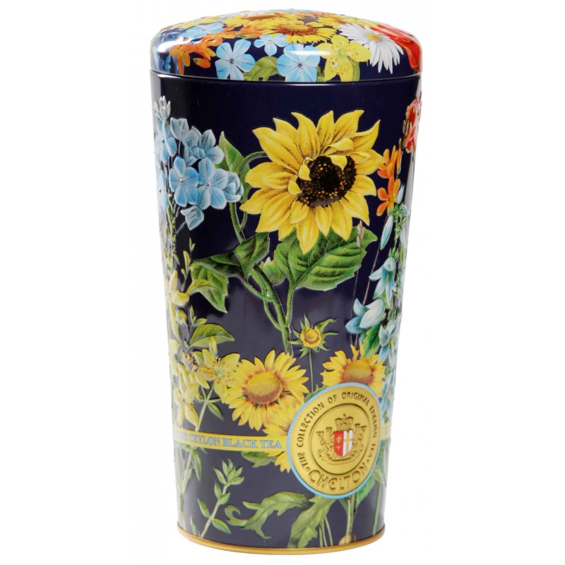 Schwarzer Ceylon Tee mit Mango-/Aprikosenstückchen, Sonnenblumen-/Lilien-/Malven-/Ringelblumenblätter; Blaubeer-/ und Erdbeer-Aroma. Verpackt in einer metallischen Dose, geformt wie eine Vase.