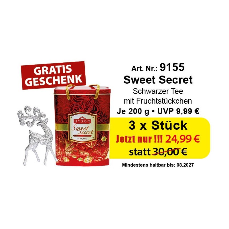 Verpackt in einer Metalldose,gestaltet wie eine Tasche + ein Geschenk (ein Reh zum Aufstellen/Aufhängen) gratis in jeder Dose.